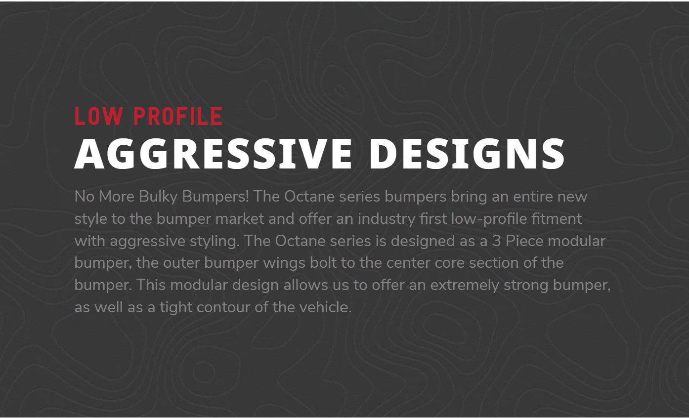 The Octane series bumpers bring an entire new style to the bumper market and offer an industry first low-profile fitment with aggressive styling. The Octane series is designed as a 3 Piece modular bumper, the outer bumper wings bolt to the center core section of the bumper. This modular design allows us to offer an extreme tight contour of the vehicle, as well as a product design & extreme strength that will last a lifetime. All of Chassis Unlimited’ s products are designed & manufactured in Livermore California.