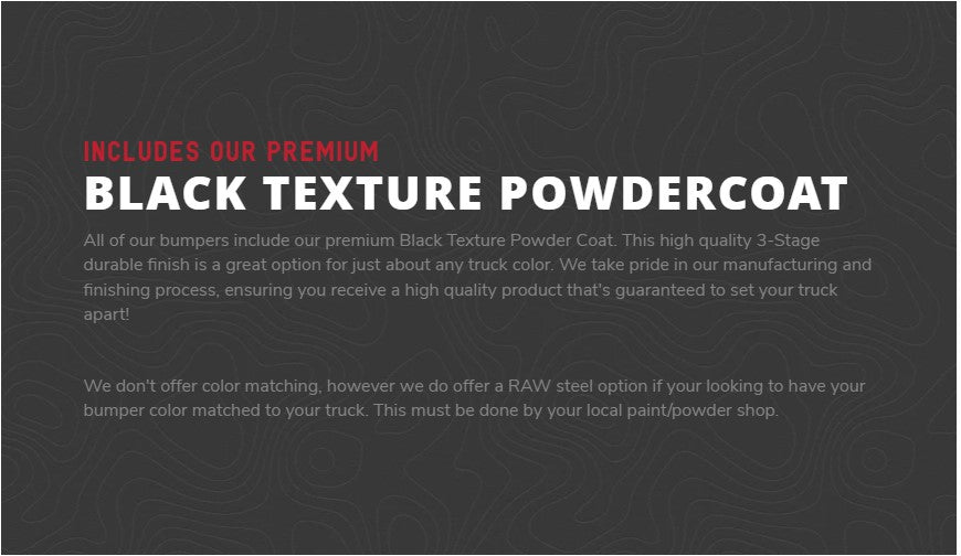 - Bumpers ships complete with 3-stage black texture powder coat