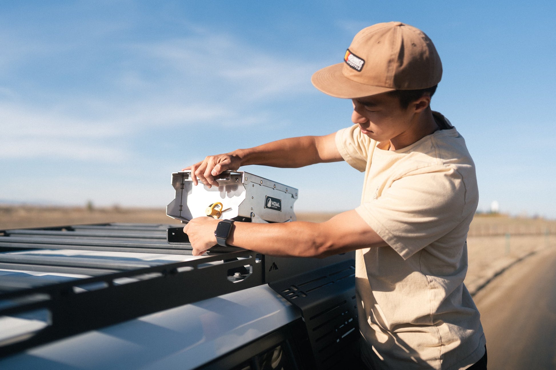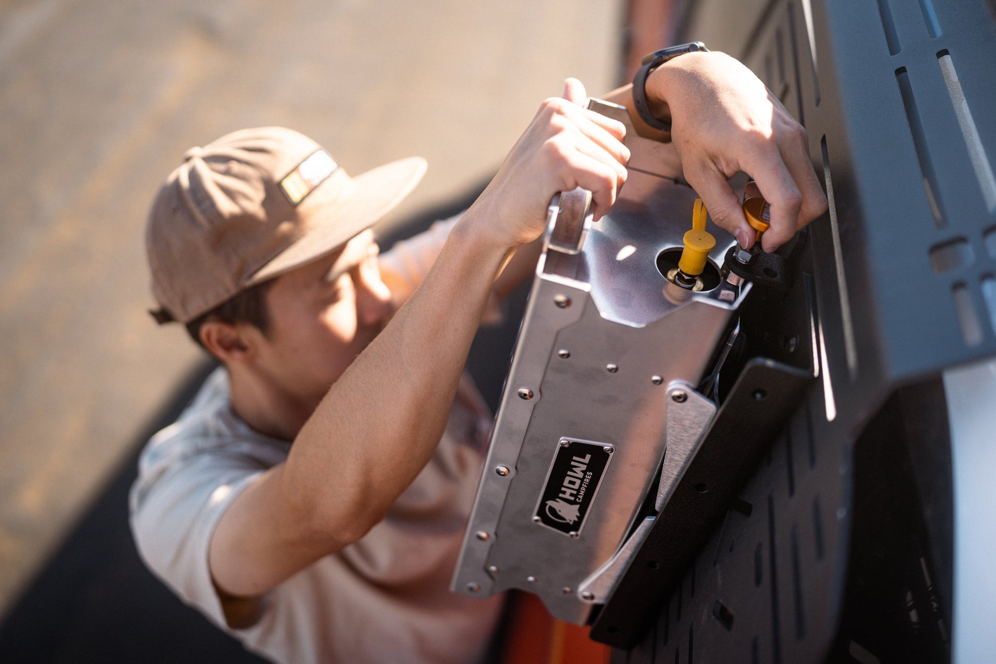The R1 RallyMount is built to take a beating. It's a low-profile, rattle-free mounting plate that locks your R1 Campfire onto your van box, roof rack, ladder, Molle panel, bedrail – or anything else you can run 1/4” bolts through.